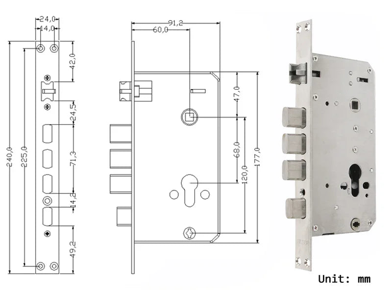 A Ideal Advanced está disponível nas medidas padrão de 24x240mm. Ela é compatível com portas que tenham entre 3,5 cm e 12,0 cm de espessura.